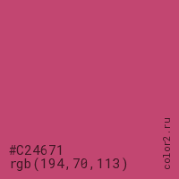 Цвет #C24671 в цветовой модели RGB обозначается тремя октетами (194, 70, 113) в десятичном формате и #C24671 в шестнадцатиричном (hex) формате, которые являются интенсивностью красного 194 (hex C2), интенсивность зелёного 70 (hex 46) и интенсивность синего 113 (hex 71).
