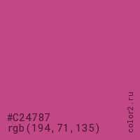 Цвет #C24787 в цветовой модели RGB обозначается тремя октетами (194, 71, 135) в десятичном формате и #C24787 в шестнадцатиричном (hex) формате, которые являются интенсивностью красного 194 (hex C2), интенсивность зелёного 71 (hex 47) и интенсивность синего 135 (hex 87).