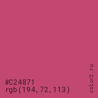 Цвет #C24871 в цветовой модели RGB обозначается тремя октетами (194, 72, 113) в десятичном формате и #C24871 в шестнадцатиричном (hex) формате, которые являются интенсивностью красного 194 (hex C2), интенсивность зелёного 72 (hex 48) и интенсивность синего 113 (hex 71).