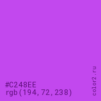 Цвет #C248EE в цветовой модели RGB обозначается тремя октетами (194, 72, 238) в десятичном формате и #C248EE в шестнадцатиричном (hex) формате, которые являются интенсивностью красного 194 (hex C2), интенсивность зелёного 72 (hex 48) и интенсивность синего 238 (hex EE).