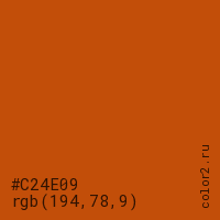 Цвет #C24E09 в цветовой модели RGB обозначается тремя октетами (194, 78, 9) в десятичном формате и #C24E09 в шестнадцатиричном (hex) формате, которые являются интенсивностью красного 194 (hex C2), интенсивность зелёного 78 (hex 4E) и интенсивность синего 9 (hex 09).