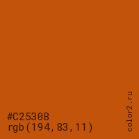 Цвет #C2530B в цветовой модели RGB обозначается тремя октетами (194, 83, 11) в десятичном формате и #C2530B в шестнадцатиричном (hex) формате, которые являются интенсивностью красного 194 (hex C2), интенсивность зелёного 83 (hex 53) и интенсивность синего 11 (hex 0B).