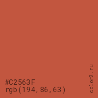 Цвет #C2563F в цветовой модели RGB обозначается тремя октетами (194, 86, 63) в десятичном формате и #C2563F в шестнадцатиричном (hex) формате, которые являются интенсивностью красного 194 (hex C2), интенсивность зелёного 86 (hex 56) и интенсивность синего 63 (hex 3F).
