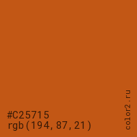 Цвет #C25715 в цветовой модели RGB обозначается тремя октетами (194, 87, 21) в десятичном формате и #C25715 в шестнадцатиричном (hex) формате, которые являются интенсивностью красного 194 (hex C2), интенсивность зелёного 87 (hex 57) и интенсивность синего 21 (hex 15).