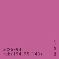 Цвет #C25F94 в цветовой модели RGB обозначается тремя октетами (194, 95, 148) в десятичном формате и #C25F94 в шестнадцатиричном (hex) формате, которые являются интенсивностью красного 194 (hex C2), интенсивность зелёного 95 (hex 5F) и интенсивность синего 148 (hex 94).