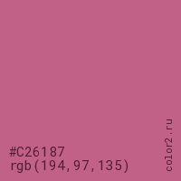 Цвет #C26187 в цветовой модели RGB обозначается тремя октетами (194, 97, 135) в десятичном формате и #C26187 в шестнадцатиричном (hex) формате, которые являются интенсивностью красного 194 (hex C2), интенсивность зелёного 97 (hex 61) и интенсивность синего 135 (hex 87).