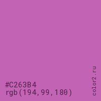 Цвет #C263B4 в цветовой модели RGB обозначается тремя октетами (194, 99, 180) в десятичном формате и #C263B4 в шестнадцатиричном (hex) формате, которые являются интенсивностью красного 194 (hex C2), интенсивность зелёного 99 (hex 63) и интенсивность синего 180 (hex B4).