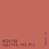 Цвет #C2675B в цветовой модели RGB обозначается тремя октетами (194, 103, 91) в десятичном формате и #C2675B в шестнадцатиричном (hex) формате, которые являются интенсивностью красного 194 (hex C2), интенсивность зелёного 103 (hex 67) и интенсивность синего 91 (hex 5B).