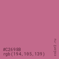 Цвет #C2698B в цветовой модели RGB обозначается тремя октетами (194, 105, 139) в десятичном формате и #C2698B в шестнадцатиричном (hex) формате, которые являются интенсивностью красного 194 (hex C2), интенсивность зелёного 105 (hex 69) и интенсивность синего 139 (hex 8B).