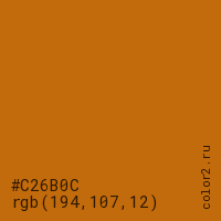 Цвет #C26B0C в цветовой модели RGB обозначается тремя октетами (194, 107, 12) в десятичном формате и #C26B0C в шестнадцатиричном (hex) формате, которые являются интенсивностью красного 194 (hex C2), интенсивность зелёного 107 (hex 6B) и интенсивность синего 12 (hex 0C).