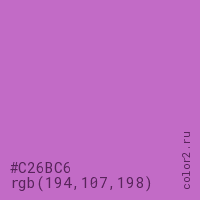 Цвет #C26BC6 в цветовой модели RGB обозначается тремя октетами (194, 107, 198) в десятичном формате и #C26BC6 в шестнадцатиричном (hex) формате, которые являются интенсивностью красного 194 (hex C2), интенсивность зелёного 107 (hex 6B) и интенсивность синего 198 (hex C6).