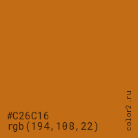 Цвет #C26C16 в цветовой модели RGB обозначается тремя октетами (194, 108, 22) в десятичном формате и #C26C16 в шестнадцатиричном (hex) формате, которые являются интенсивностью красного 194 (hex C2), интенсивность зелёного 108 (hex 6C) и интенсивность синего 22 (hex 16).