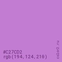 Цвет #C27CD2 в цветовой модели RGB обозначается тремя октетами (194, 124, 210) в десятичном формате и #C27CD2 в шестнадцатиричном (hex) формате, которые являются интенсивностью красного 194 (hex C2), интенсивность зелёного 124 (hex 7C) и интенсивность синего 210 (hex D2).