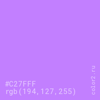 Цвет #C27FFF в цветовой модели RGB обозначается тремя октетами (194, 127, 255) в десятичном формате и #C27FFF в шестнадцатиричном (hex) формате, которые являются интенсивностью красного 194 (hex C2), интенсивность зелёного 127 (hex 7F) и интенсивность синего 255 (hex FF).