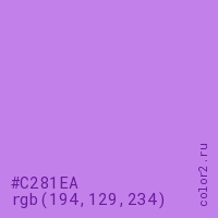 Цвет #C281EA в цветовой модели RGB обозначается тремя октетами (194, 129, 234) в десятичном формате и #C281EA в шестнадцатиричном (hex) формате, которые являются интенсивностью красного 194 (hex C2), интенсивность зелёного 129 (hex 81) и интенсивность синего 234 (hex EA).