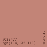 Цвет #C28477 в цветовой модели RGB обозначается тремя октетами (194, 132, 119) в десятичном формате и #C28477 в шестнадцатиричном (hex) формате, которые являются интенсивностью красного 194 (hex C2), интенсивность зелёного 132 (hex 84) и интенсивность синего 119 (hex 77).