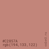Цвет #C2857A в цветовой модели RGB обозначается тремя октетами (194, 133, 122) в десятичном формате и #C2857A в шестнадцатиричном (hex) формате, которые являются интенсивностью красного 194 (hex C2), интенсивность зелёного 133 (hex 85) и интенсивность синего 122 (hex 7A).
