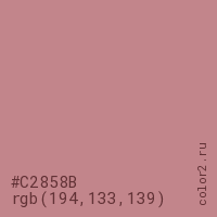 Цвет #C2858B в цветовой модели RGB обозначается тремя октетами (194, 133, 139) в десятичном формате и #C2858B в шестнадцатиричном (hex) формате, которые являются интенсивностью красного 194 (hex C2), интенсивность зелёного 133 (hex 85) и интенсивность синего 139 (hex 8B).