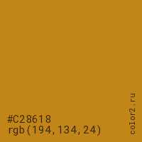 Цвет #C28618 в цветовой модели RGB обозначается тремя октетами (194, 134, 24) в десятичном формате и #C28618 в шестнадцатиричном (hex) формате, которые являются интенсивностью красного 194 (hex C2), интенсивность зелёного 134 (hex 86) и интенсивность синего 24 (hex 18).