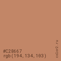 Цвет #C28667 в цветовой модели RGB обозначается тремя октетами (194, 134, 103) в десятичном формате и #C28667 в шестнадцатиричном (hex) формате, которые являются интенсивностью красного 194 (hex C2), интенсивность зелёного 134 (hex 86) и интенсивность синего 103 (hex 67).