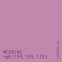 Цвет #C287AC в цветовой модели RGB обозначается тремя октетами (194, 135, 172) в десятичном формате и #C287AC в шестнадцатиричном (hex) формате, которые являются интенсивностью красного 194 (hex C2), интенсивность зелёного 135 (hex 87) и интенсивность синего 172 (hex AC).