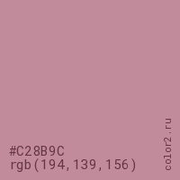 Цвет #C28B9C в цветовой модели RGB обозначается тремя октетами (194, 139, 156) в десятичном формате и #C28B9C в шестнадцатиричном (hex) формате, которые являются интенсивностью красного 194 (hex C2), интенсивность зелёного 139 (hex 8B) и интенсивность синего 156 (hex 9C).