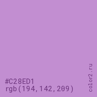 Цвет #C28ED1 в цветовой модели RGB обозначается тремя октетами (194, 142, 209) в десятичном формате и #C28ED1 в шестнадцатиричном (hex) формате, которые являются интенсивностью красного 194 (hex C2), интенсивность зелёного 142 (hex 8E) и интенсивность синего 209 (hex D1).