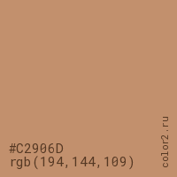 Цвет #C2906D в цветовой модели RGB обозначается тремя октетами (194, 144, 109) в десятичном формате и #C2906D в шестнадцатиричном (hex) формате, которые являются интенсивностью красного 194 (hex C2), интенсивность зелёного 144 (hex 90) и интенсивность синего 109 (hex 6D).