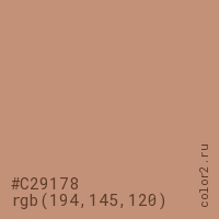 Цвет #C29178 в цветовой модели RGB обозначается тремя октетами (194, 145, 120) в десятичном формате и #C29178 в шестнадцатиричном (hex) формате, которые являются интенсивностью красного 194 (hex C2), интенсивность зелёного 145 (hex 91) и интенсивность синего 120 (hex 78).