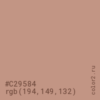 Цвет #C29584 в цветовой модели RGB обозначается тремя октетами (194, 149, 132) в десятичном формате и #C29584 в шестнадцатиричном (hex) формате, которые являются интенсивностью красного 194 (hex C2), интенсивность зелёного 149 (hex 95) и интенсивность синего 132 (hex 84).