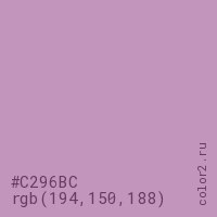 Цвет #C296BC в цветовой модели RGB обозначается тремя октетами (194, 150, 188) в десятичном формате и #C296BC в шестнадцатиричном (hex) формате, которые являются интенсивностью красного 194 (hex C2), интенсивность зелёного 150 (hex 96) и интенсивность синего 188 (hex BC).
