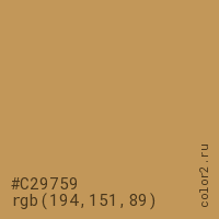 Цвет #C29759 в цветовой модели RGB обозначается тремя октетами (194, 151, 89) в десятичном формате и #C29759 в шестнадцатиричном (hex) формате, которые являются интенсивностью красного 194 (hex C2), интенсивность зелёного 151 (hex 97) и интенсивность синего 89 (hex 59).