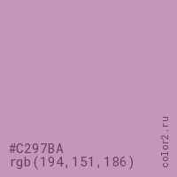 Цвет #C297BA в цветовой модели RGB обозначается тремя октетами (194, 151, 186) в десятичном формате и #C297BA в шестнадцатиричном (hex) формате, которые являются интенсивностью красного 194 (hex C2), интенсивность зелёного 151 (hex 97) и интенсивность синего 186 (hex BA).
