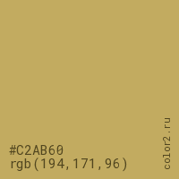 Цвет #C2AB60 в цветовой модели RGB обозначается тремя октетами (194, 171, 96) в десятичном формате и #C2AB60 в шестнадцатиричном (hex) формате, которые являются интенсивностью красного 194 (hex C2), интенсивность зелёного 171 (hex AB) и интенсивность синего 96 (hex 60).