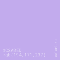 Цвет #C2ABED в цветовой модели RGB обозначается тремя октетами (194, 171, 237) в десятичном формате и #C2ABED в шестнадцатиричном (hex) формате, которые являются интенсивностью красного 194 (hex C2), интенсивность зелёного 171 (hex AB) и интенсивность синего 237 (hex ED).