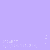 Цвет #C2ABFE в цветовой модели RGB обозначается тремя октетами (194, 171, 254) в десятичном формате и #C2ABFE в шестнадцатиричном (hex) формате, которые являются интенсивностью красного 194 (hex C2), интенсивность зелёного 171 (hex AB) и интенсивность синего 254 (hex FE).