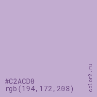 Цвет #C2ACD0 в цветовой модели RGB обозначается тремя октетами (194, 172, 208) в десятичном формате и #C2ACD0 в шестнадцатиричном (hex) формате, которые являются интенсивностью красного 194 (hex C2), интенсивность зелёного 172 (hex AC) и интенсивность синего 208 (hex D0).
