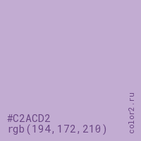 Цвет #C2ACD2 в цветовой модели RGB обозначается тремя октетами (194, 172, 210) в десятичном формате и #C2ACD2 в шестнадцатиричном (hex) формате, которые являются интенсивностью красного 194 (hex C2), интенсивность зелёного 172 (hex AC) и интенсивность синего 210 (hex D2).