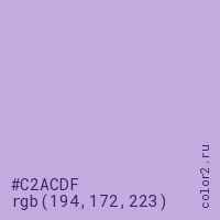 Цвет #C2ACDF в цветовой модели RGB обозначается тремя октетами (194, 172, 223) в десятичном формате и #C2ACDF в шестнадцатиричном (hex) формате, которые являются интенсивностью красного 194 (hex C2), интенсивность зелёного 172 (hex AC) и интенсивность синего 223 (hex DF).