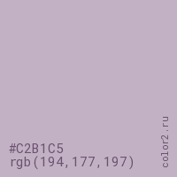 Цвет #C2B1C5 в цветовой модели RGB обозначается тремя октетами (194, 177, 197) в десятичном формате и #C2B1C5 в шестнадцатиричном (hex) формате, которые являются интенсивностью красного 194 (hex C2), интенсивность зелёного 177 (hex B1) и интенсивность синего 197 (hex C5).