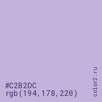 Цвет #C2B2DC в цветовой модели RGB обозначается тремя октетами (194, 178, 220) в десятичном формате и #C2B2DC в шестнадцатиричном (hex) формате, которые являются интенсивностью красного 194 (hex C2), интенсивность зелёного 178 (hex B2) и интенсивность синего 220 (hex DC).