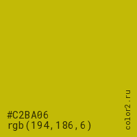 Цвет #C2BA06 в цветовой модели RGB обозначается тремя октетами (194, 186, 6) в десятичном формате и #C2BA06 в шестнадцатиричном (hex) формате, которые являются интенсивностью красного 194 (hex C2), интенсивность зелёного 186 (hex BA) и интенсивность синего 6 (hex 06).