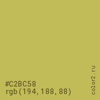 Цвет #C2BC58 в цветовой модели RGB обозначается тремя октетами (194, 188, 88) в десятичном формате и #C2BC58 в шестнадцатиричном (hex) формате, которые являются интенсивностью красного 194 (hex C2), интенсивность зелёного 188 (hex BC) и интенсивность синего 88 (hex 58).