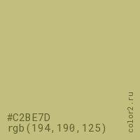 Цвет #C2BE7D в цветовой модели RGB обозначается тремя октетами (194, 190, 125) в десятичном формате и #C2BE7D в шестнадцатиричном (hex) формате, которые являются интенсивностью красного 194 (hex C2), интенсивность зелёного 190 (hex BE) и интенсивность синего 125 (hex 7D).