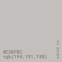 Цвет #C2BFBC в цветовой модели RGB обозначается тремя октетами (194, 191, 188) в десятичном формате и #C2BFBC в шестнадцатиричном (hex) формате, которые являются интенсивностью красного 194 (hex C2), интенсивность зелёного 191 (hex BF) и интенсивность синего 188 (hex BC).