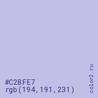 Цвет #C2BFE7 в цветовой модели RGB обозначается тремя октетами (194, 191, 231) в десятичном формате и #C2BFE7 в шестнадцатиричном (hex) формате, которые являются интенсивностью красного 194 (hex C2), интенсивность зелёного 191 (hex BF) и интенсивность синего 231 (hex E7).