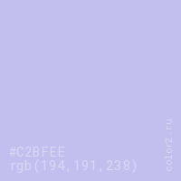 Цвет #C2BFEE в цветовой модели RGB обозначается тремя октетами (194, 191, 238) в десятичном формате и #C2BFEE в шестнадцатиричном (hex) формате, которые являются интенсивностью красного 194 (hex C2), интенсивность зелёного 191 (hex BF) и интенсивность синего 238 (hex EE).