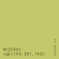 Цвет #C2C96C в цветовой модели RGB обозначается тремя октетами (194, 201, 108) в десятичном формате и #C2C96C в шестнадцатиричном (hex) формате, которые являются интенсивностью красного 194 (hex C2), интенсивность зелёного 201 (hex C9) и интенсивность синего 108 (hex 6C).