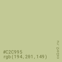 Цвет #C2C995 в цветовой модели RGB обозначается тремя октетами (194, 201, 149) в десятичном формате и #C2C995 в шестнадцатиричном (hex) формате, которые являются интенсивностью красного 194 (hex C2), интенсивность зелёного 201 (hex C9) и интенсивность синего 149 (hex 95).