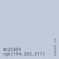 Цвет #C2CAD9 в цветовой модели RGB обозначается тремя октетами (194, 202, 217) в десятичном формате и #C2CAD9 в шестнадцатиричном (hex) формате, которые являются интенсивностью красного 194 (hex C2), интенсивность зелёного 202 (hex CA) и интенсивность синего 217 (hex D9).